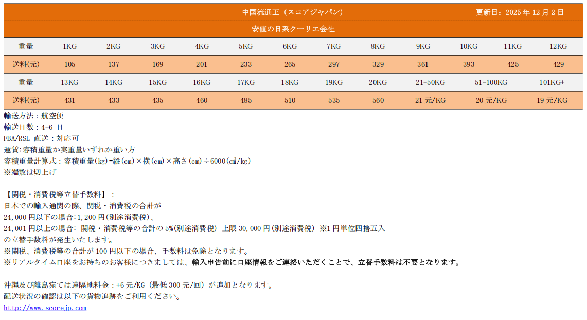 2025年12月2日より中国流通王(スコアジャパン)運賃が改定となりましたのでご案内申し上げます。